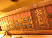 当時、二階のお座敷には芸者さんを呼ぶことが多く、太鼓持ちの方に頂いた物、鮨屋連合の方から頂いた物、魚河岸から頂いた物である。今では珍しい品となっている。